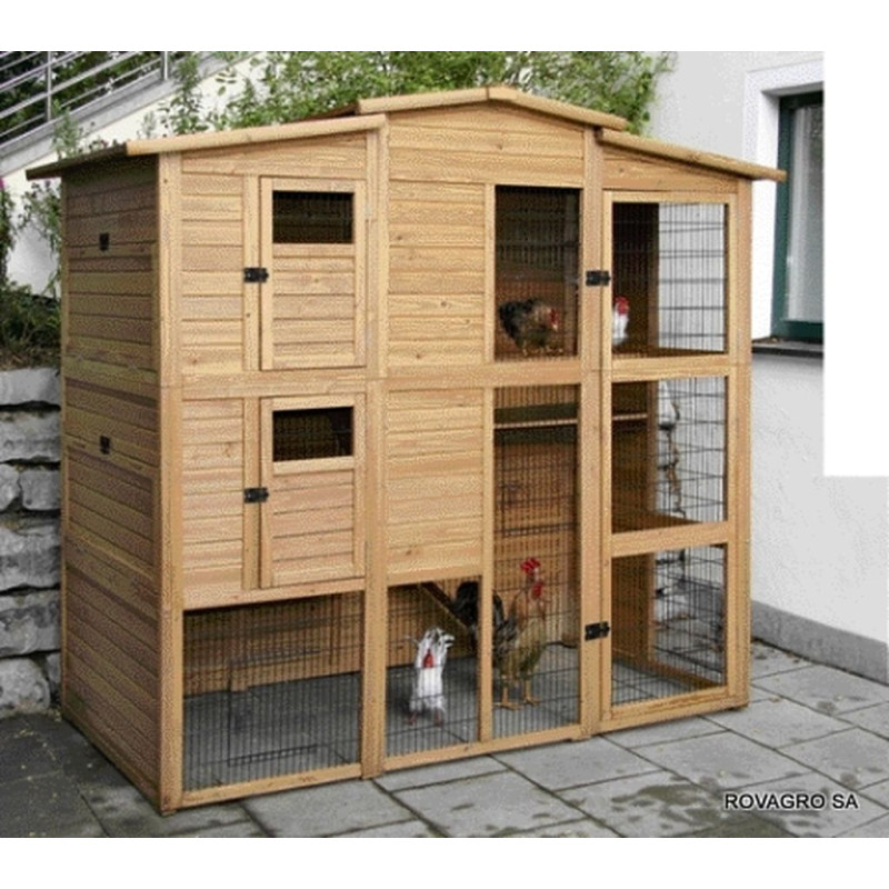 Exklusives Hühnerhaus in stabiler Ausführung, hochwertiges Gitter, für 10-15 Hühner. 6 Türen einzeln zu öffnen und verriegeln Böden kunststoffbeschichtet 2 Etagen mit Treppe verbunden 2 Schiebetüren zum Gehege Wetterfestes Bitumendach, mit Holzschutzfarbe lasiert. Zubehör: 3 Legenester pro Etage, mit Zugriffsmöglichkeit von außen, Ausgehrampe, 2 Holzsitzstangen im Gehege mit kunststoffbeschichtetem Kotbrett Lieferung erfolgt zerlegt in 3 Kartons, inkl. Aufbauanleitung und DVD/einfache Montage durch Stecksystem Aussenabmessungen: L 222 x l 115 x h 200 cm Innenabmessungen: L 197 x l 98 cm x h 200 cm