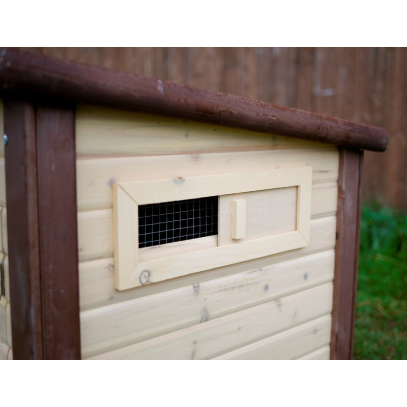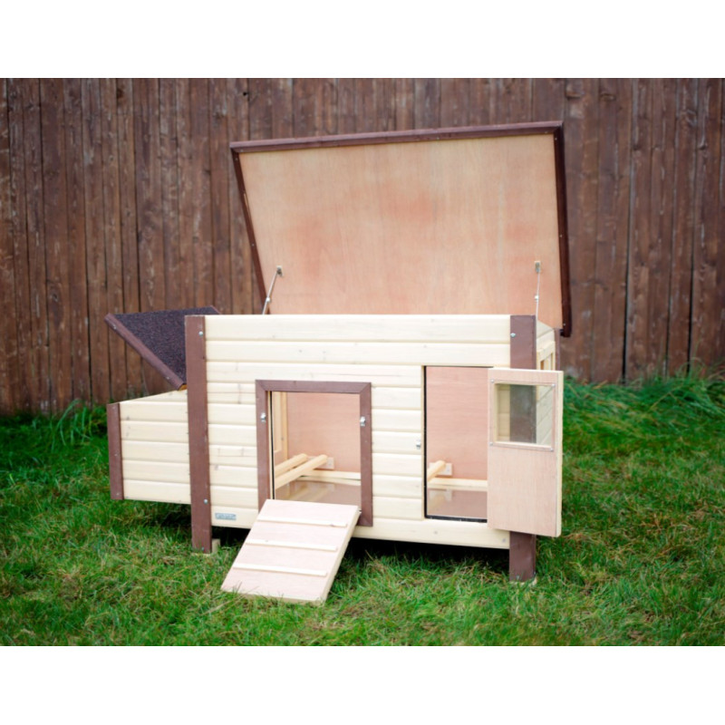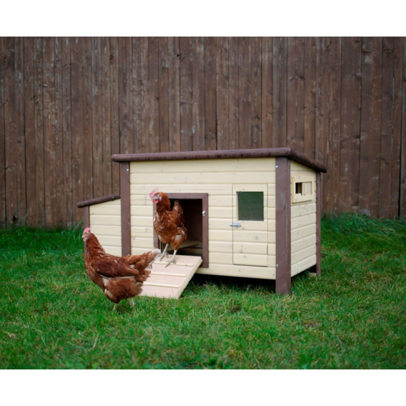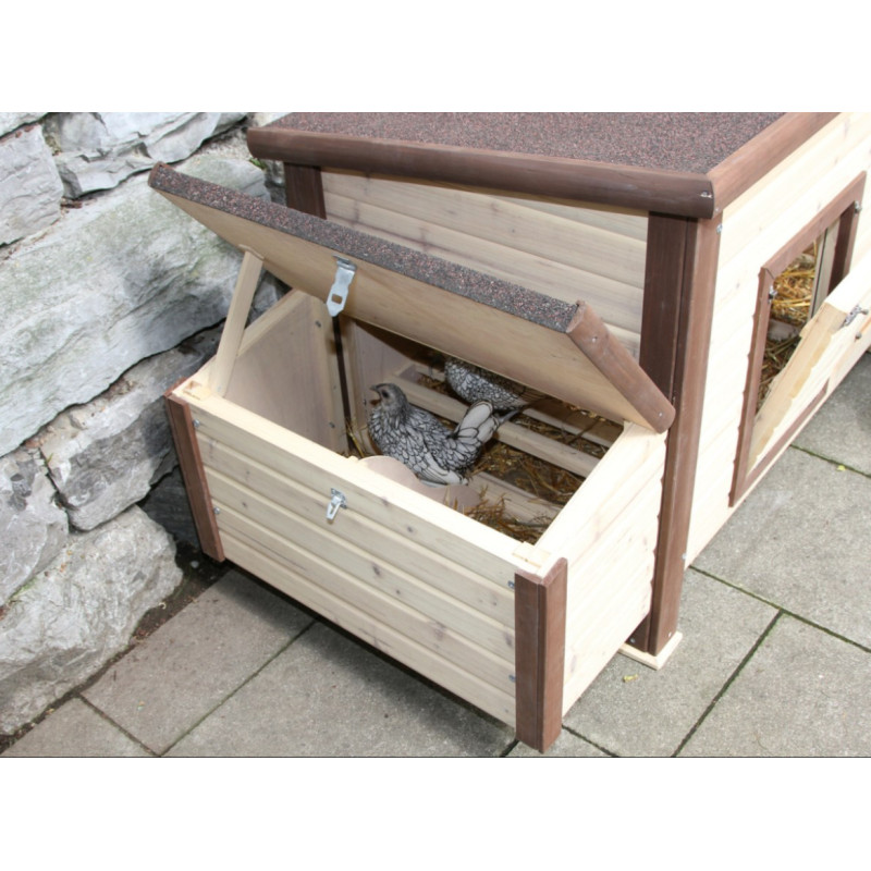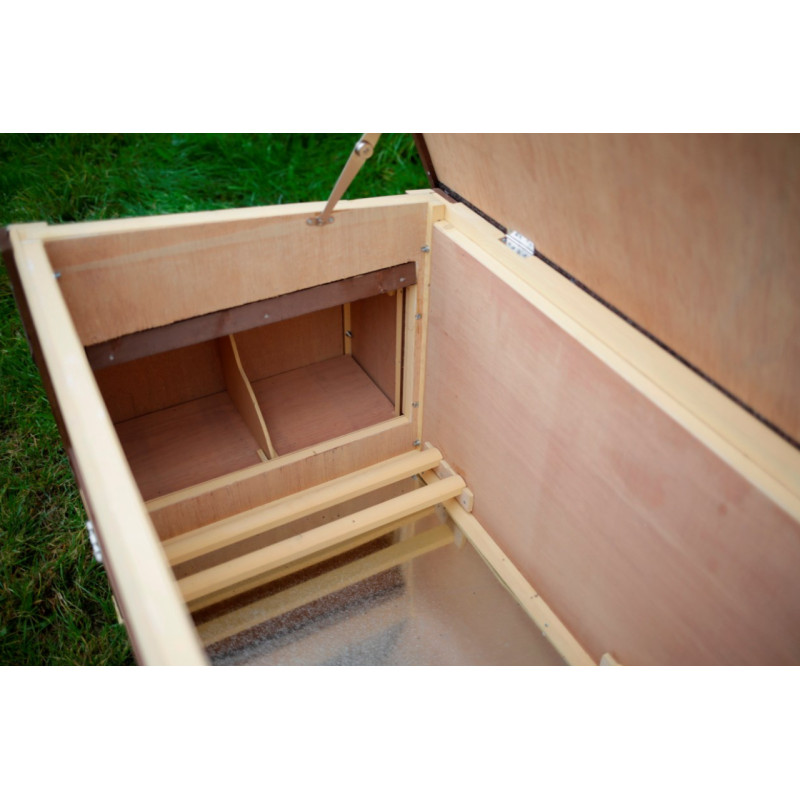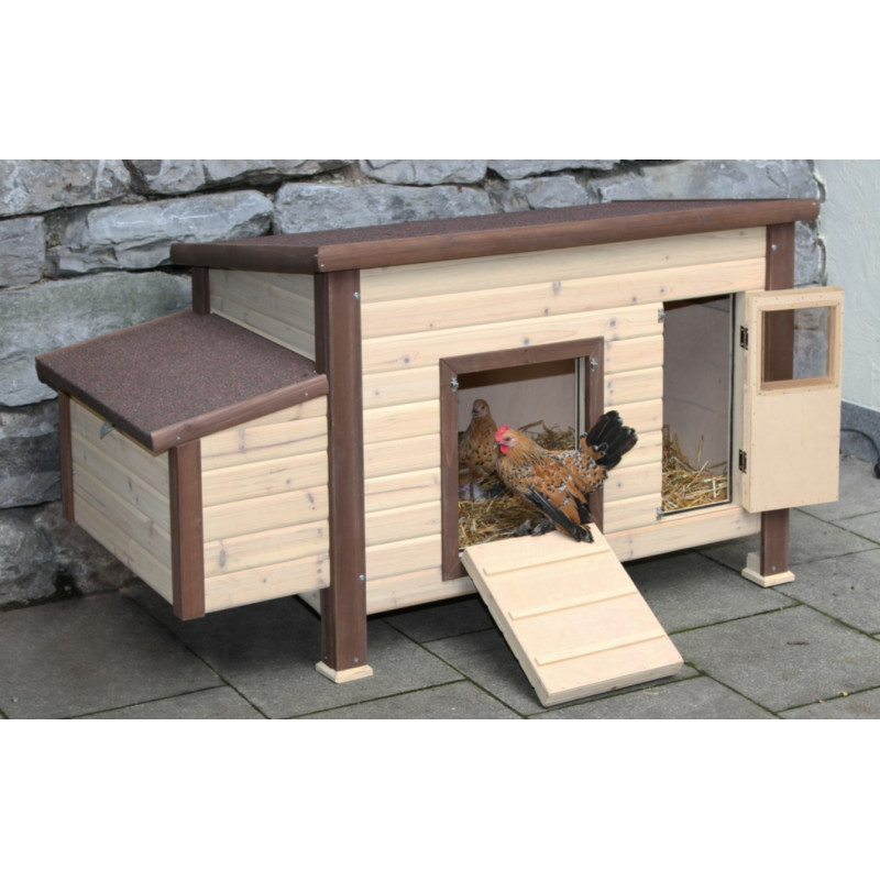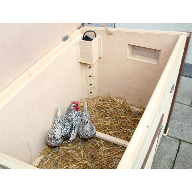 Temperaturregelung durch integriertes Thermostat (Schaltung zwischen ca. 6 und 13 Grad Raumtemperatur). In der Bodenfläche eingebaute Heizschlangen halten den Innenraum frostfrei. Sicherer 24 Volt Betrieb. Mit Trafo für den Anschluss an 230 Volt Stromversorgung. Doppelwandige Bauweise mit Isolierung (Wandstärke 3,5 cm). Bodenoberfläche verzinkt für Haltbarkeit und leichte Reinigung. Auch bestens für die Aufzucht geeignet. Inkl. Legenest und drei Sitzstangen. Mit Schiebefenster für variable Luftzirkulation. Hochwertige Verarbeitung mit Holzschutzfarbe auf Wasserbasis lasiert. Aufklappbares Bitumendach mit Dachfixierung.