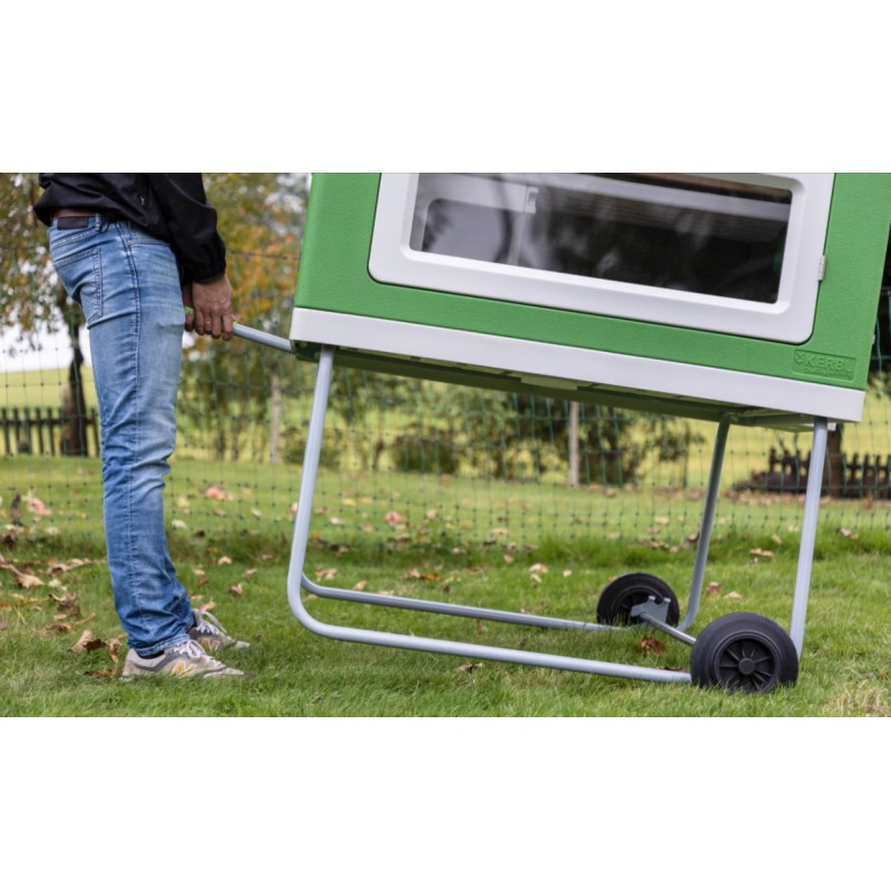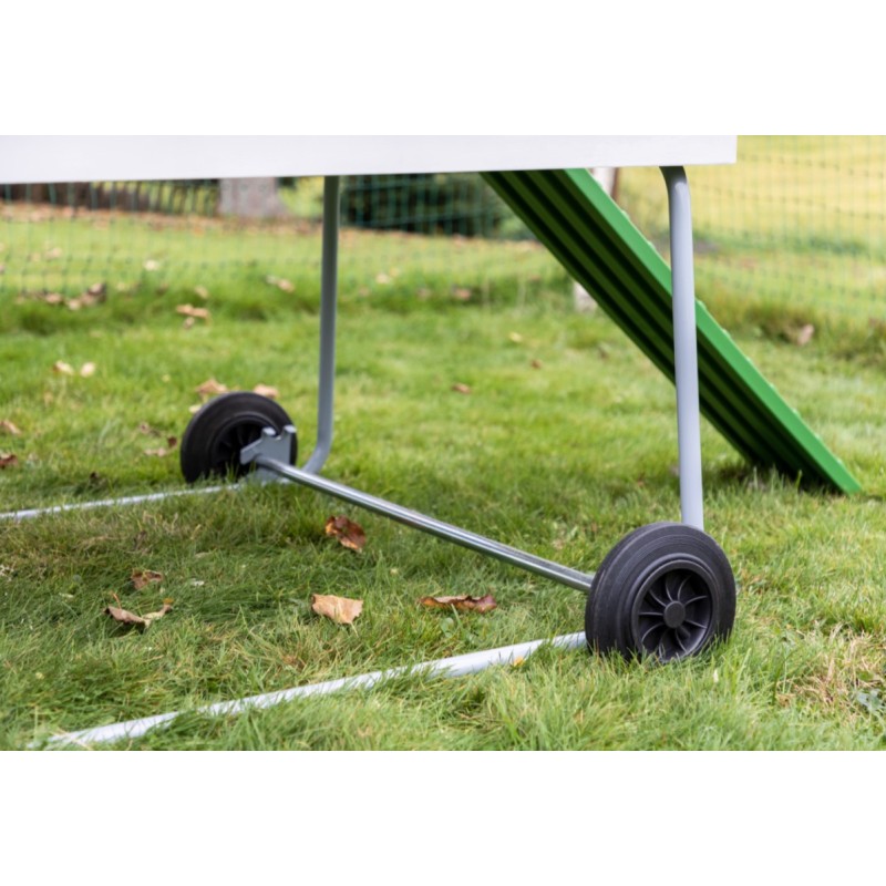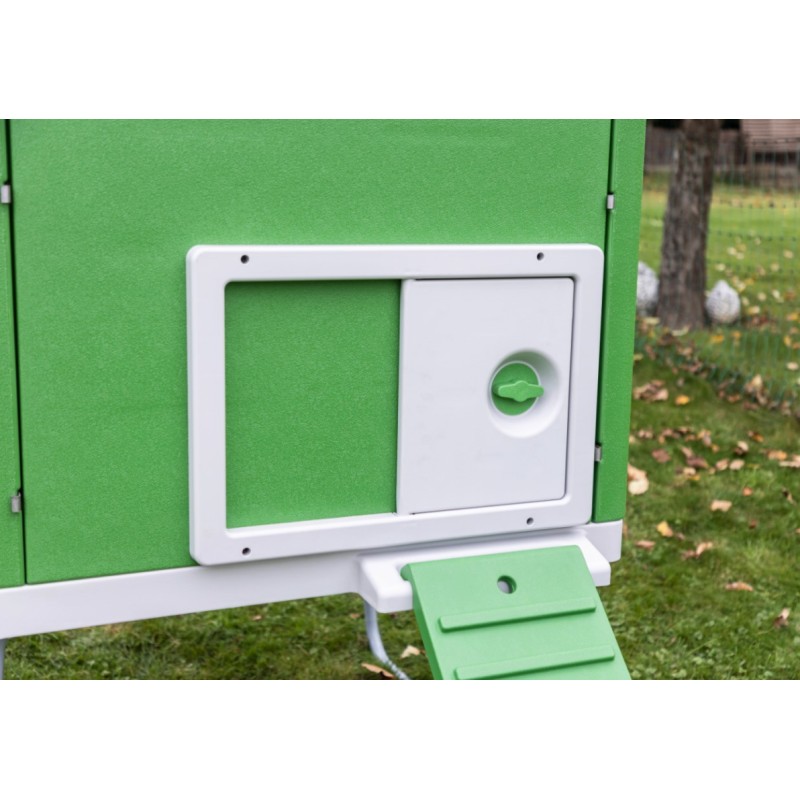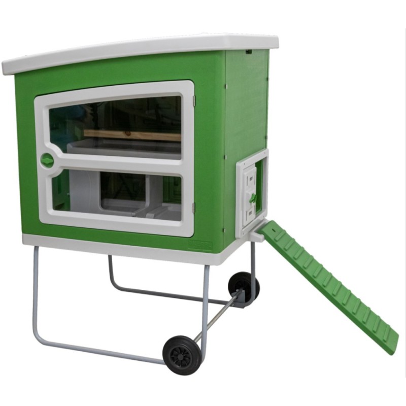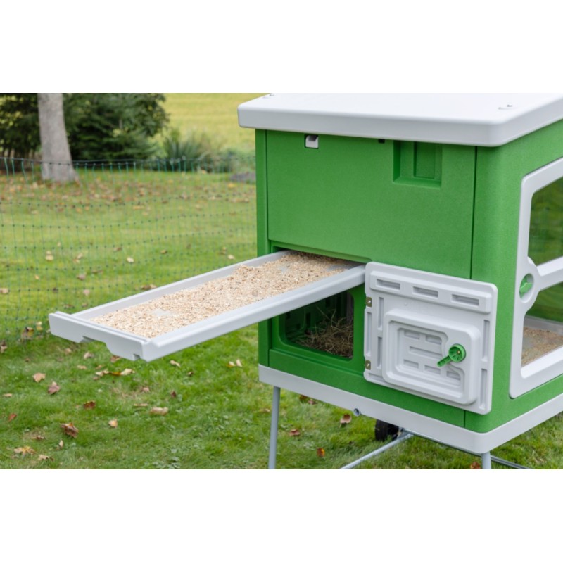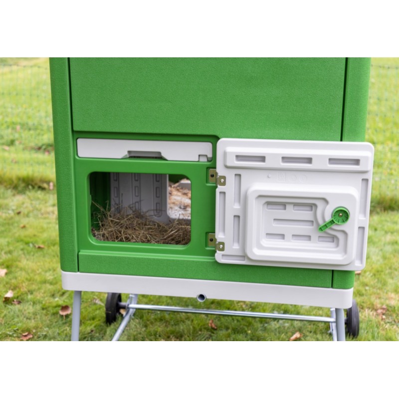 Extra Öffnung des Legenests ermöglicht schnelle Eientnahme. Tür mit großem Fenster sorgt für Helligkeit im Stall und garantiert einen gesunden Tag-Nacht-Rhythmus. Sichere Türverriegelung schützt vor unerwünschten Gästen (z. B. Marder, Fuchs, Waschbär). Sehr stabiles Metallgestell mit zwei Rädern und Griff an der Seite zum Anheben und einfachen Verfahren.