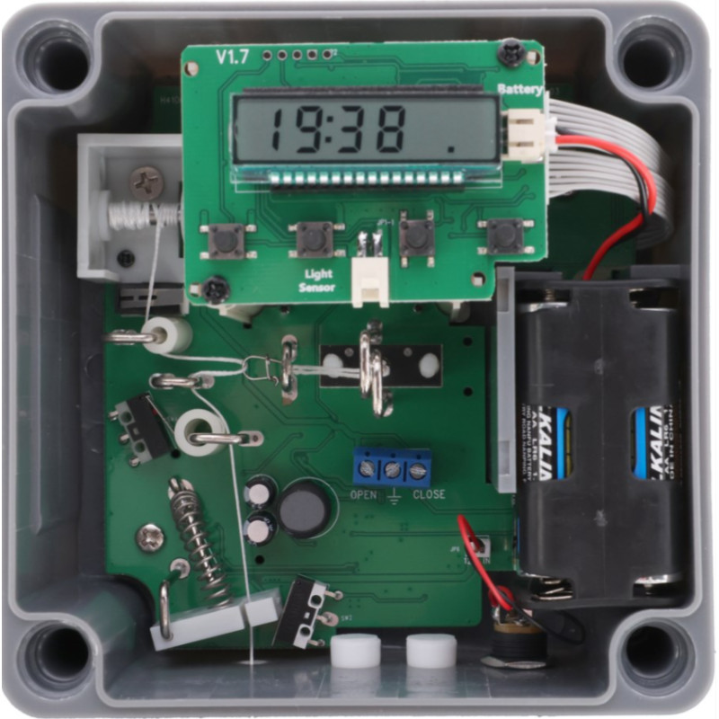 Automatisches tageslicht- und uhrzeitabhängiges Öffnen und Schließen der Hühnertür zum Schutz vor nachtaktiven Raubtieren. Integrierte Selbstverriegelung verhindert ungewolltes Öffnen der Tür von außen und schützt vor Eindringlingen. Lichtsensor mit 1-Meter-Kabel ermöglicht Montage der Steuerung im Innenbereich. Manuelle Steuerung am Gerät. Sehr einfache Handhabung und Montage, da Steuerung bereits an Tür montiert. Kompakte Bauweise ermöglicht auch das Anbringen an niedrigen Geflügelställen. Kein ungewolltes Öffnen durch Blitze oder kurzzeitige Helligkeit dank zeitlich verzögerter Reaktion des Lichtsensors. Erhöhte Sicherheit durch automatische Abschaltung des Motors bei oeberlastung und Stoppfunktion bei Widerstand mit anschließender Fortsetzung des Schließvorgangs. Batteriebetrieb (4x AA Mignon im Lieferumfang enthalten) oder Netzbetrieb möglich.