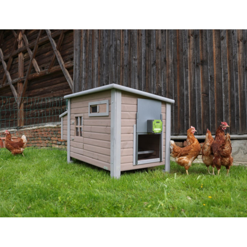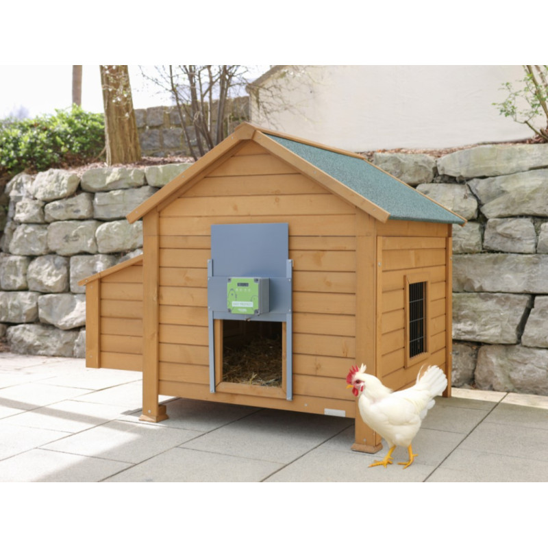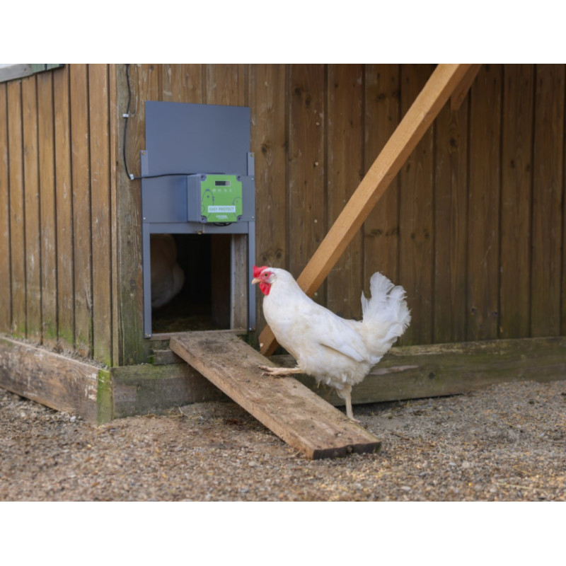 Die Hühnertür Easy Protect bietet effektiven Schutz für Hühnerställe dank uhrzeit- bzw. tageslichtabhängiger Steuerung. Sie kann sowohl über einen Stromanschluss als auch mit Batterien betrieben werden, bietet dadurch maximale Flexibilität und ist dank ihrer kompakten Bauweise auch für kleine Ställe geeignet.