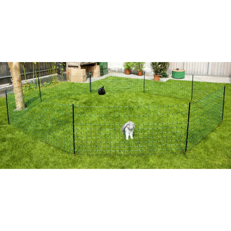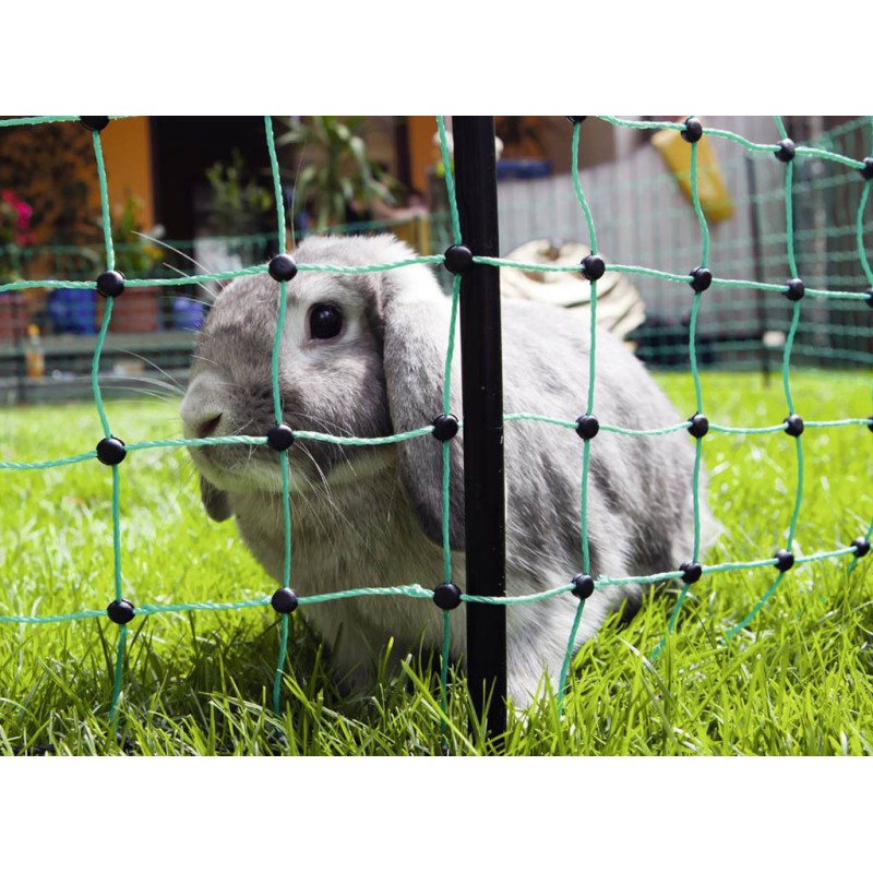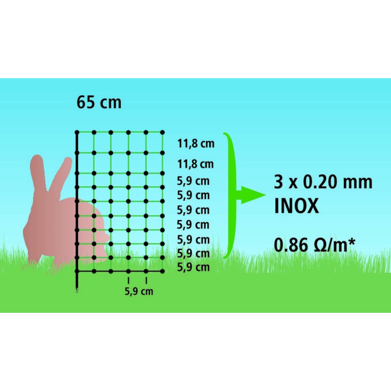 Elektrifizierbares Kaninchennetz , für sicheres Hüten Ihrer Hasen. Netzhöhe von 65 cm mit Einzelspitze. Die extra kleine Maschenweite 5,9 cm gewährleistet höchste Hütesicherheit! Netzlänge 25 m 3.5 kg