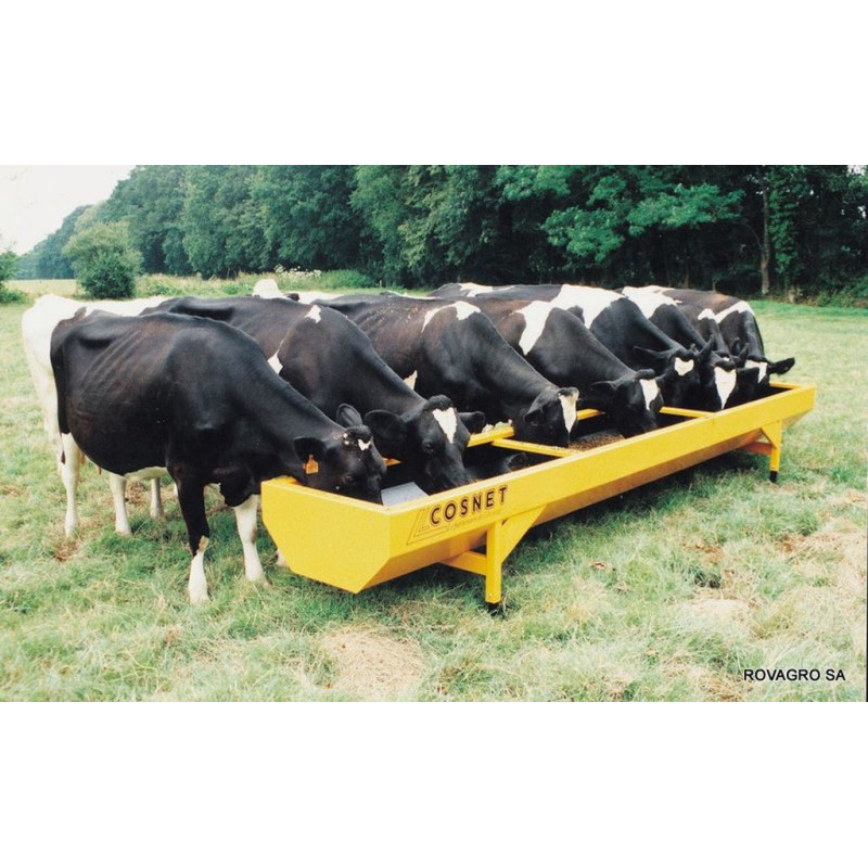 HYGIENE - FESTIGKEIT - STABILITÄT Lackierter Blech-Futtertrog für Rinder aus gekantetem Stahlblech, Wandstärke 2 mm, in einer Länge gefertigt (2 Zwischenstäbe für Längen über 4 Meter). Schutz durch Industrielack auf der Außenseite und Bitumen- Anstrich im Inneren der Trogwanne. Zur besseren Langlebigkeit wird empfohlen, diesen regelmäßig zu erneuern (je nach Säuregehalt der Silage alle 2 Jahre) Anti-Futterverschwendungsrand von 80 mm. Schraubstopfen mit großem Durchmesser 45 mm. Trog Ecken ausgeklinkt für stärkere Schweißnähte und Abdichtung. Die feuerverzinkten Füße Ø 42,4 mm sind mit einem durchgehenden Bolzen in 7 cm Schritten höhenverstellbar (um Futterverschwendung zu vermeiden kann der Trog geneigt aufgestellt werden). Fußbreite gleich wie der Trog, mit einer Verstärkungsstange und Winkelverstärkungen, die sich der Trogform gut anpassen. Abmessungen : 0,6 x 3 x 0,38 m Volumen 480 L 79 kg