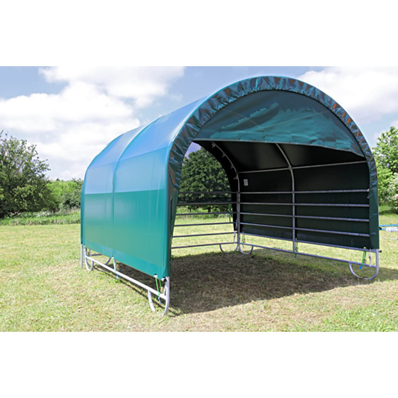Mobiler Weideunterstand "MobilBox II" aus verzinktem, starkem Rundrohr Ø 42 mm, mit einer Wandstärke von 2 mm. Er eignet sich optimal als Weideunterstand für Pferde, Rinder, Ziegen und Schafe. Bietet Komfort und Schutz bei jeder Witterung. Dank einer Höhe von 3,18 m kann er auch als Unterstand für Maschinen/Fahrzeuge jeglicher Art, sowie zum Einlagern von Holz oder Stroh genutzt werden. Lieferung ohne Deckplane Maße : Breite 4 m - Länge 6 m - Höhe 3,18 m Gewicht : 620 kg