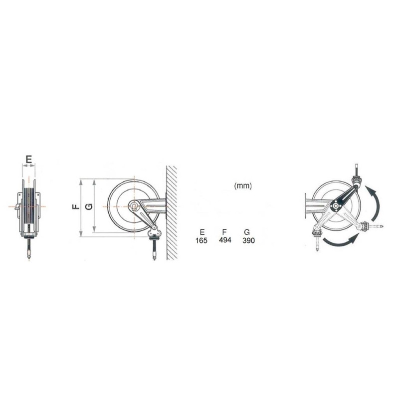 Automatischer Schlauchaufroller mit 15 m Wasserschlauch- Ø innen 12,5 mm (1/2") PVC-Schlauch Kaltwasser max 8 bar/ 50°C Federrückspulmechanismus Verriegelungssysteme Gehäuse aus lackiertem Stahl. Feste Montagehalterung Verstellbare Arme mit Rollenführung. In jeder Position montierbar 15,7 Kg