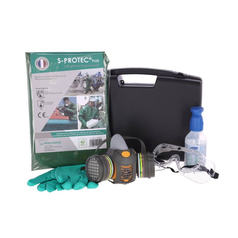 Persönliche Schutzausrüstung beim Umgang mit Pflanzenschutzmitteln, auch für Gefahrguttransporte geeignet. 1 x dichtsitzende Schutzbrille 1 Paar Nitrilhandschuhe Gr. 10 /XL Typ A 1 x Augenspülflasche 250 ml mit 4,9 % Phosphatpufferlösung 1 x Atemschutzhalbmaske Vulcano gem. 1 Paar Mehrbereichskombifilter A1B1E1K1P3 R 1 x Ärmelschürze Im praktischen staubdichten Aufbewahrungskoffer 39 x 29 x 10,5 cm