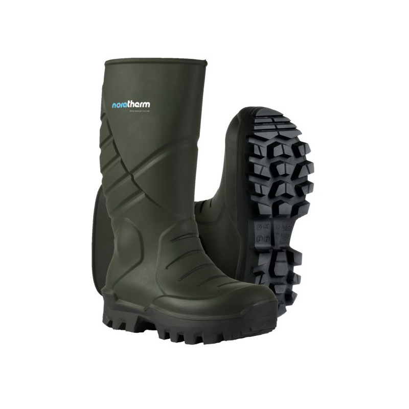PU-Thermo-Sicherheitsstiefel mit Stahlkappe und Stahlzwischensohle Extrem leicht, nur 1300 g Kälteflexibel und kälteisolierend bis -50 °C Hervorragendes Tragegefühl durch anatomisches Fußbett und ergonomisch geformten Schaft Sehr gute Abrollbewegung durch flexiblen Schaft im Spann extrem langlebig durch neuartiges PU-System von BASF "ELASTOPAN" Extrem rutschhemmende Profilsohle (SRC) durch optimierte Profilgeometrie Selbstreinigende Profillaufsohle NORA PU-Einlegesohle Standard: extrem auftrittsdämpfend, extrem feuchtigkeitsaufnehmend Sehr gute Beständigkeit gegen: tierische Fette, Gülle, Blut, organische Säuren, Basen, Hydrokarbonat, Alkohol Schmutzabweisende, leicht zu reinigende Oberfläche Ausziehhilfe