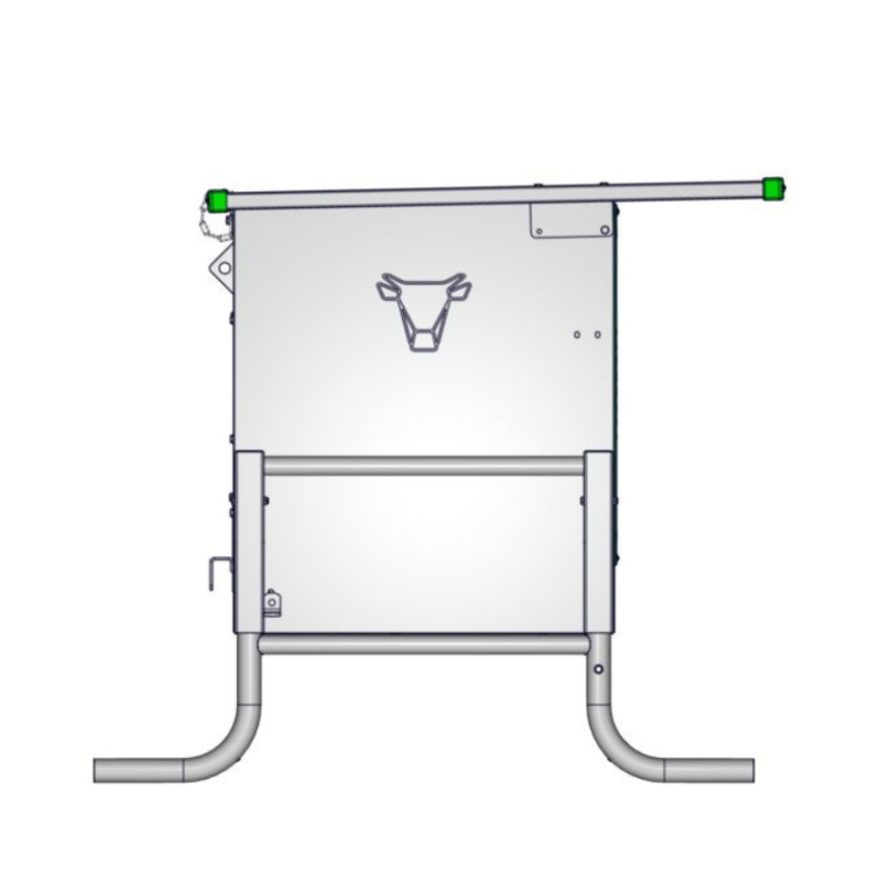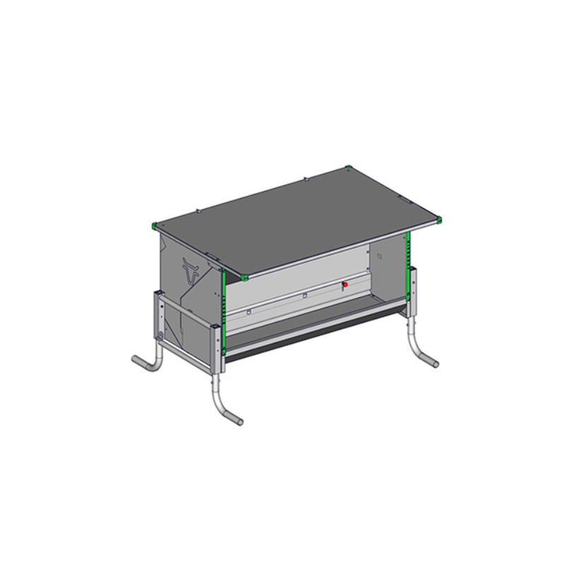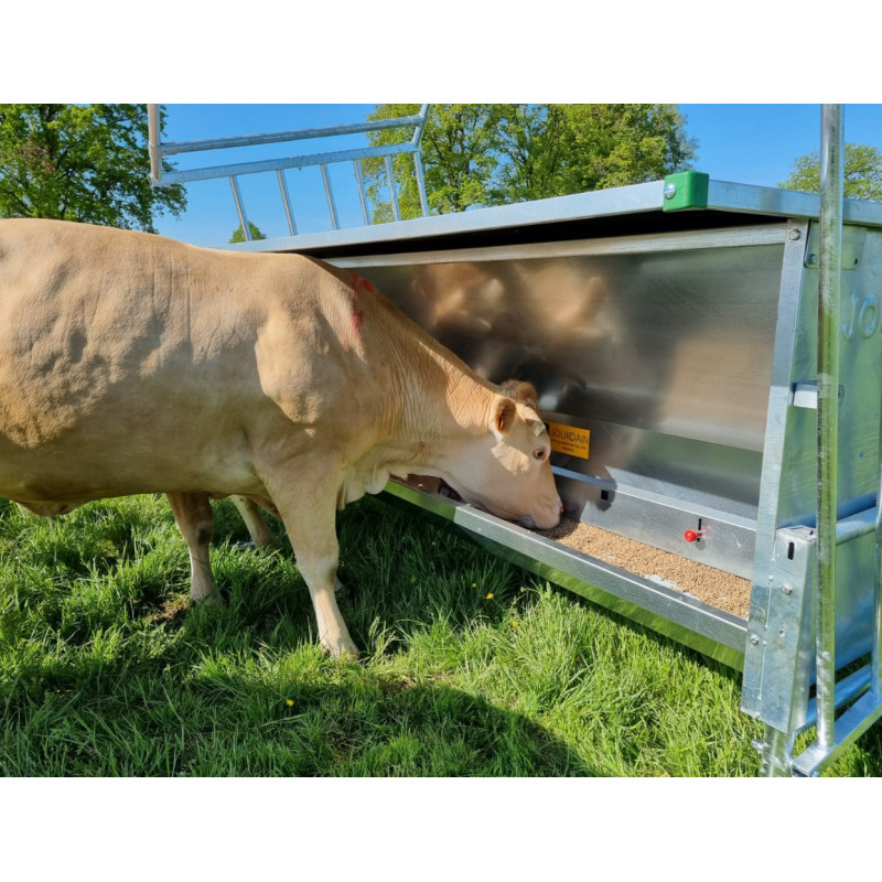 Futterautomat für ausgewachsene Rinder mit einer Länge von 2,50 m. Er ist aus verzinktem Blech gefertigt und verfügt über eine Klappe zur Regulierung der Futtermenge, ein großes Kippdach mit einem verstärkten Innenrohr an der Vorderseite. Die Füße haben zwei Montagehöhen, wobei der Futterautomat für den Einsatz bei großen Rindern am höchsten positioniert ist. Er hat eine Futterkapazität von 1180 Litern und wird zusammen mit seinem hinteren Dreipunkt-Transportsystem geliefert. Für den Transport auf der Straße transportieren Sie ihn bitte leer und halten Sie sich an die geltenden gesetzlichen Bestimmungen.